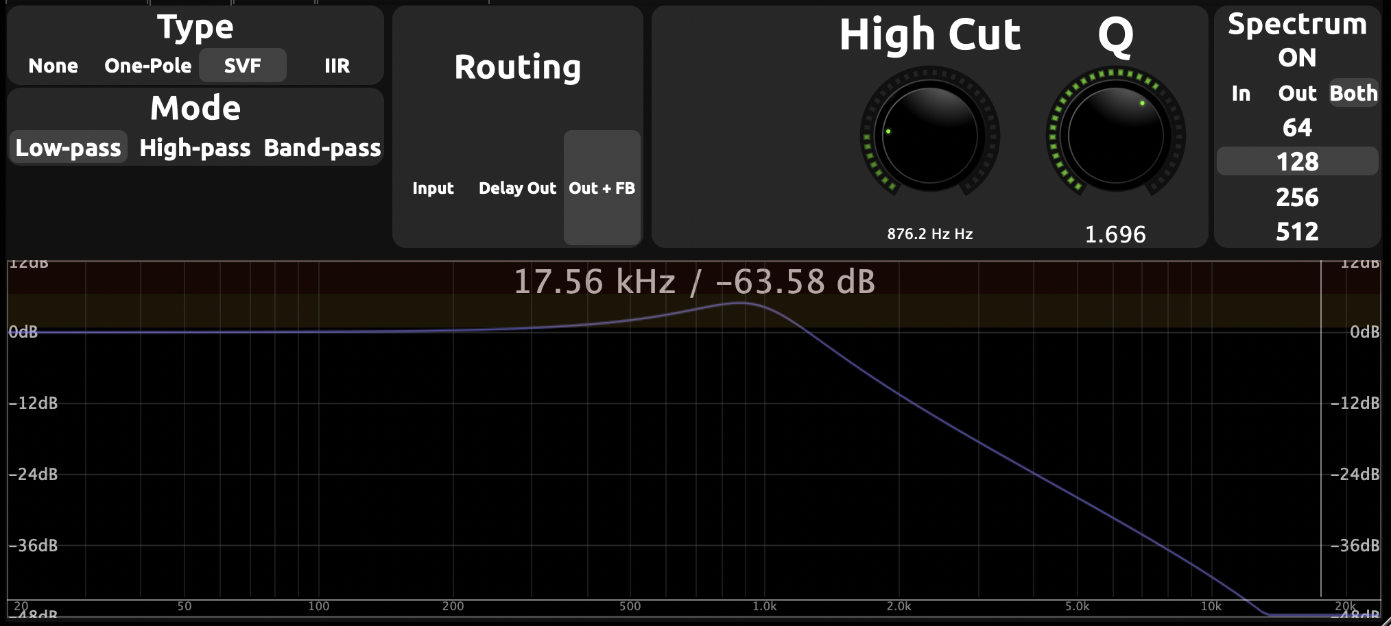 • Three filter types: One-Pole, SVF, and IIR — each with its own character