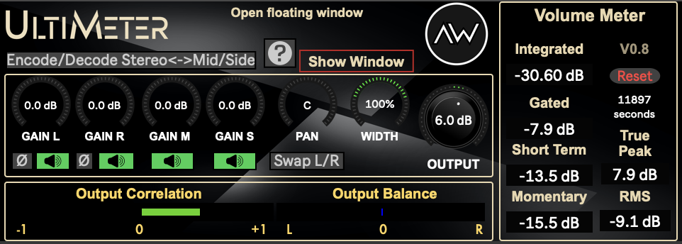 Ultimeter is the perfect combination of a utility device (including mid/side features) and a metering one (with correlation and LUFS metering), with a nice floating window (full version only), that you can use on a daily basis for all kinds of purposes, especially avoiding using channel settings for automation.